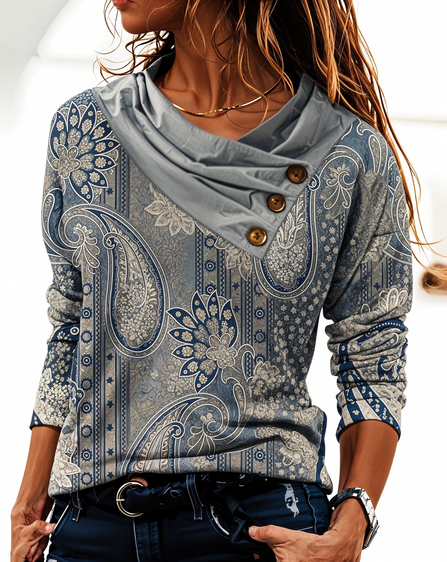 Experience effortless style with our Cowl Neck Blouse that will add a dose of elegance to your casual wardrobe. This stunning blouse with long sleeves and chic cowl neckline is a must-have for every fashionista. Designed with an eye-catching paisley print, it brings a unique touch to any outfit, making it perfect for any occasion. Combine comfort with style and feel great whether in the office or on a weekend getaway.