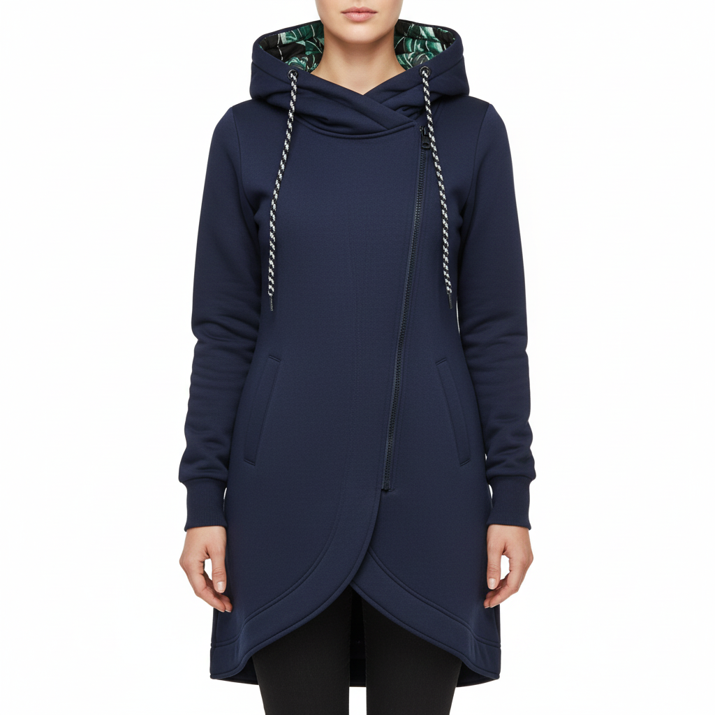 Give your wardrobe a fashionable update with our asymmetrical hoodie that makes a distinctive statement. Let yourself be enchanted by the fascinating combination of casual comfort and a touch of avant-garde. The navy blue design is complemented by a vibrant floral lining in the generous hood, creating an unexpected eye-catcher. The asymmetrical zip placket and high collar give the jacket a modern, edgy aesthetic that is guaranteed to make you stand out from the crowd. Perfect for anyone who wants to enhance their everyday look with a special detail.